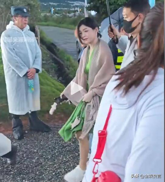 陈妍希身穿一身连衣裙加披肩,